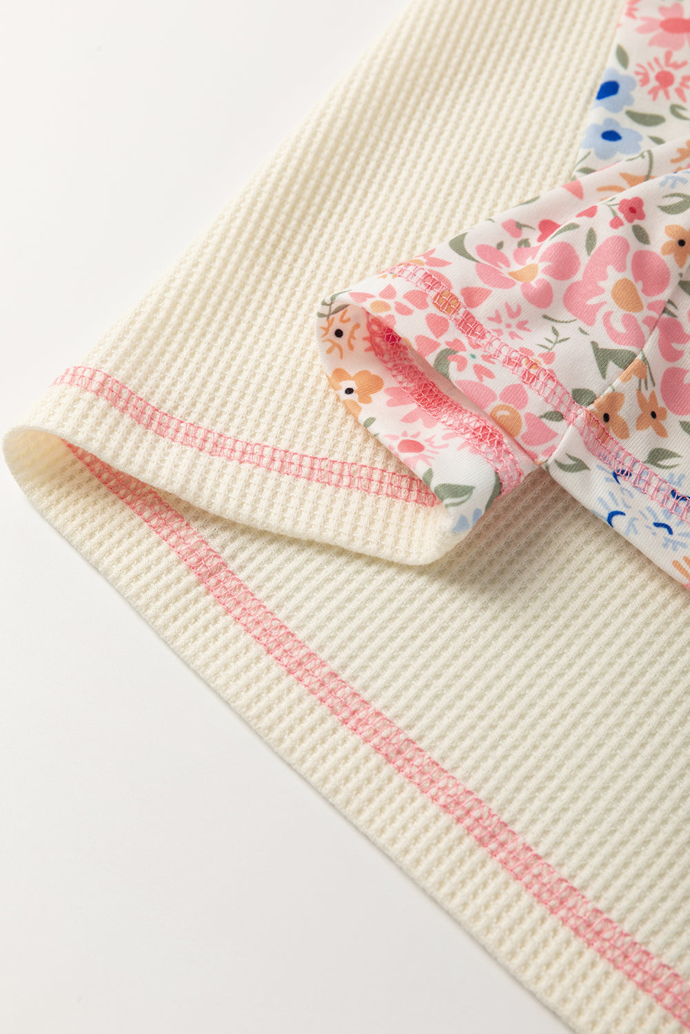 Beige Floral Patchwork Chest Pocket Wide Sleeve Waffle T Shirt