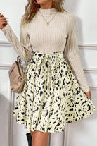 Beige Ribbed Knit Patchwork Printed Belted A-line Dress