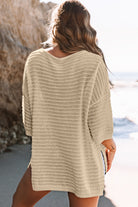 Beige Textured Knit Drop Shoulder Short Sleeve Sweater
