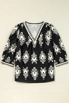 Beige Vintage Geometric Printed 3/4 Sleeve V Neck Blouse