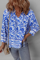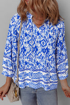 Blue Boho Printed 3/4 Sleeve Tied Neck Blouse