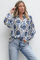 Blue Tribal Pattern Buttoned Front Loose Shirt