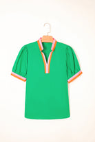 Bright Green Contrast Striped V Neck Collision Short Puff Sleeve Blouse