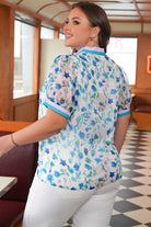 Green Floral Print Colorblock Edge Puff Sleeve Split Neck Plus Size Blouse