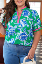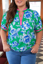 Green Floral Print Short Puff Sleeve Plus Size Top