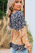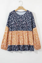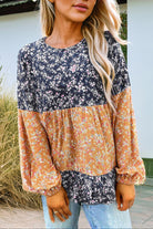 Orange Floral Color Block Patchwork Ruffled Hem Round Neck Blouse