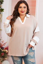 Parchment Corded Colorblock Long Sleeve Slit V Neck Plus Top