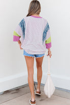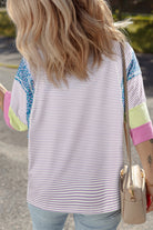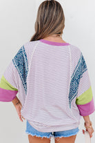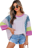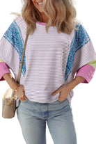 Purple Stripe Floral Color Block Raw Edge Patchwork Bracelet Sleeve Blouse