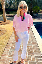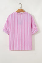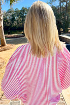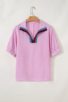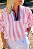 Sachet Pink Striped Print Contrast Split Neck Dolman Sleeve Blouse