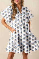 Sky Blue Floral Puff Sleeve Tied Neck Pocketed Mini Dress