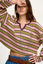 Spinach Green Clashing Stripes Waffle Texture Notched Neck Long Sleeve Top