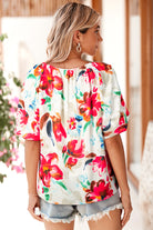 It has a pleated round neck, short puff sleeves, and loose silhouette.