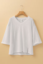 White Solid Color Corded Drop Shoulder 3/4 Sleeve V Neck Top
