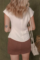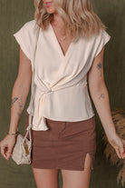 White Surplice V Neck Knotted Ruched Short Sleeve Peplum Blouse